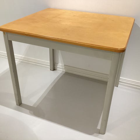 Pöydän pinnassa on kulumaa ja muutama lohkeama. Tason levy on hieman irti keskeltä, pöytä kaipaisi alkuun hieman rakkautta.