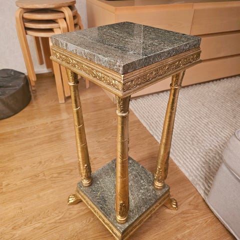 Puinen vanha kukkapylväs. 80cm korkea, pääliosan leveys 26,5cm. Alosan leveys 29,5cm.