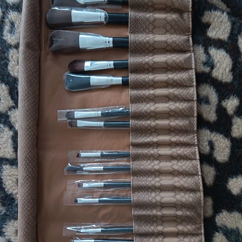 Kuvassa näkyvät duroyn, aidosta karvasta tehdyt laadukkaat ja kestävät meikkisiveltimet omassa nahkaisessa paketissaan (tai ehkä tekonahkaa). Ovat uusia ja käyttämättömiä.