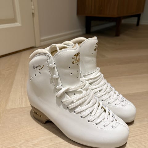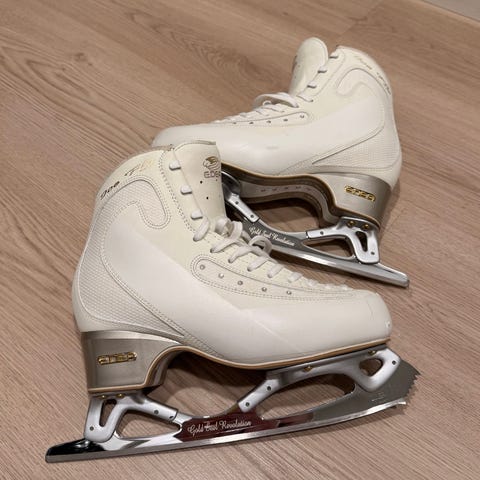 Edea Ice Fly taitoluistinkenkä koossa 255 C. Edelleen tukevat mutta käytönjälkeä ja kolhuja teristä. Nauhat pian vaihtokunnossa. Olleet käytössä yhden kauden