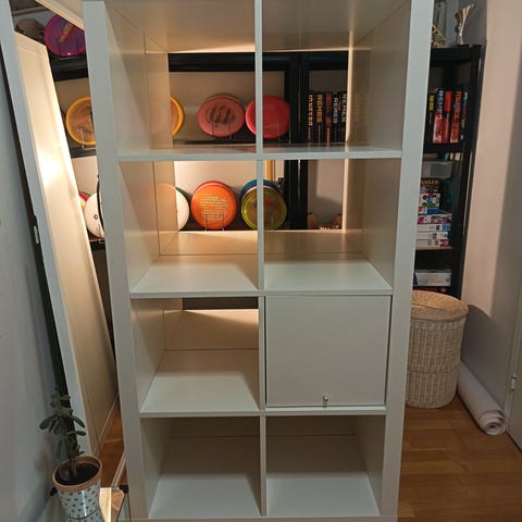 Myydään valkoinen Ikean 1x4 Expedit lokero hylly kolmella punaisella ovella.