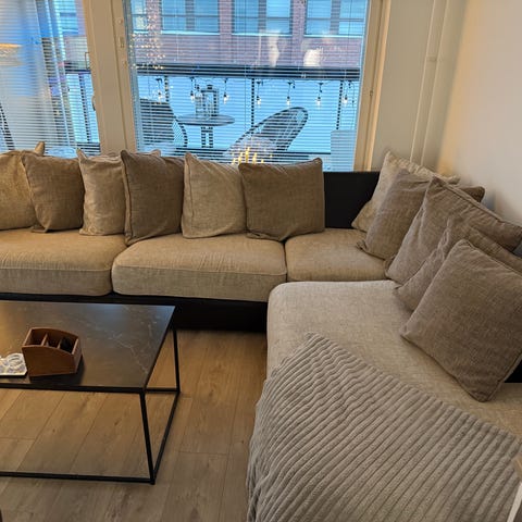 Annetaan vaalea iso kulmasohva ilmaiseksi pois. Kätisyys on vaihdettavissa.