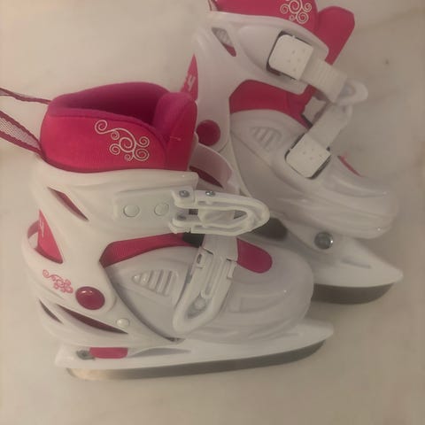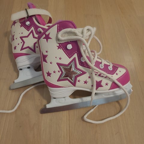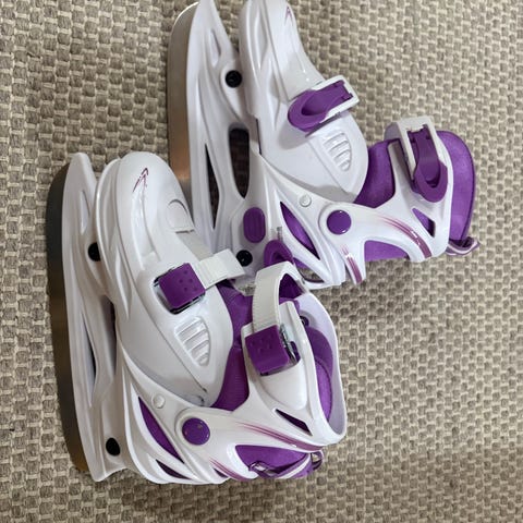 Revolution lasten luistimet, koko 28. Luistimissa on valkoinen ja violetti väriyhdistelmä. Ollut käytössä yhdellä tytöllä yhden talven. Ostettu Stadiumilta uutena.