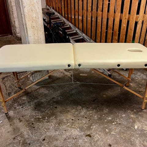 Hierontapöytä sinisellä verhoilulla ja taittuvalla puurunkoisella rakenteella. Pöydässä on säädettävä selkänoja, kasvoaukko ja irrotettavat tyynyt.