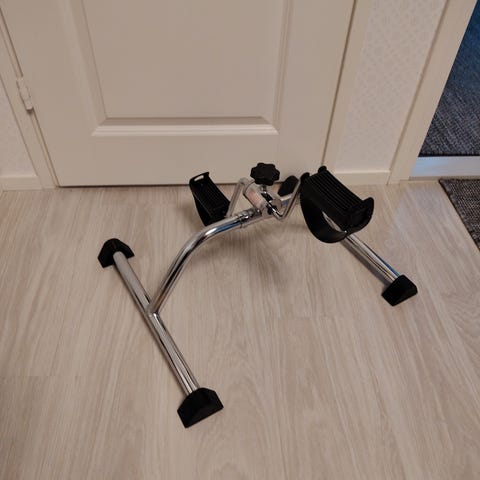 Rehband polkulaite harjoitteluun, jossa on metallirunko ja mustat polkimet. Laite soveltuu kevyempään jalkojen ja käsien liikuntaharjoitteluun kotona tai kuntoutuksessa.