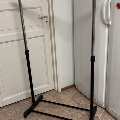 Lohikarin edustajanteline, joka taiteltavissa pienemmäksi kuin kiinteä malli. Telineessä kiinteä vakiokorkeus 158 cm, leveys 98-154 cm. On loistava esim. kotimyyjälle, vaate-edustajalle, vaatesäilytykseen tai kotikirppikselle. Toisessa rekissä on pientä ruostetta yhdessä nivelessä, ei vaikuta käyttöön.