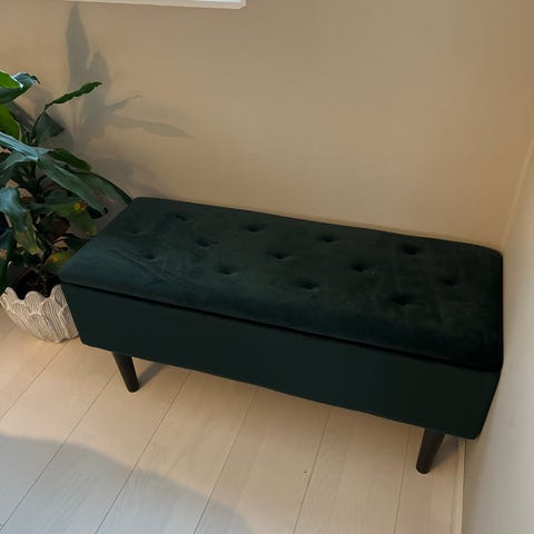 Jysk RJUKAN rahi, joka itse päällystetty valkoisella pörrö kankaalla (on myös poistettavissa). Alla tummansininen sametti. Mitat 100 x 44 x 37 cm. Ollut sisäkäytössä ja lasitetulla parvekkeella. Yhdessä jalassa maali lohkeillut (kuva).