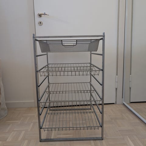 Pieneen tilaan mahtuva.Esim.tuotteiden esillepanoon.Hyllyt irroitettavissa.Ylöosa pyörii täyden ympyrän.Lykittavat pyörät alla.Hyllyissä kätevät muovitaskut vaikka hintalapuille.Lahdesta nouto.