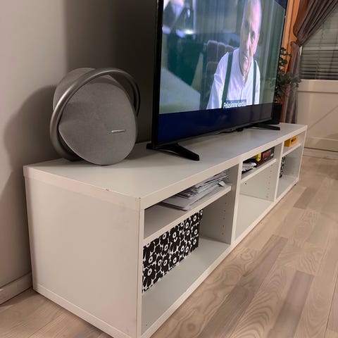 Ikean valkoinen korkeakiiltoinen tv-taso. Yleisilme siisti. Kannessa pieniä käytön jälkiä (kuvat). Kaksi vetolaatikkoa ja keskellä avohyllyt. Nouto Itä-Pakila.