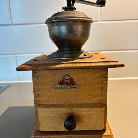 HAHA kahvimylly seinälle, jossa sinivalkoinen posliinisäiliö ja puinen tausta. Myllyssä on perinteinen kammella toimiva mekanismi, joka jauhaa kahvipavut käsin.