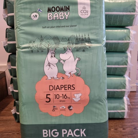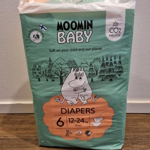 Seitsemän uutta ja ehjää Muumi 6 teippivaippapakettia koolle 12-24 kg.