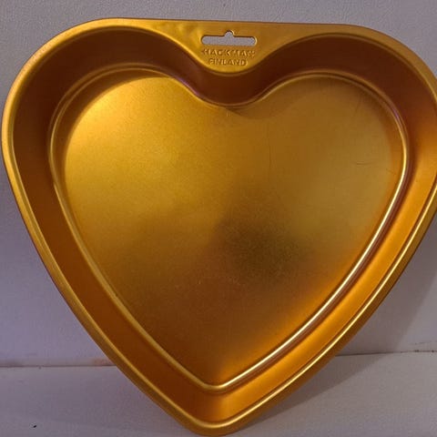 Hackman kakkuvuoka, tilavuus 1,2 litraa. Valmistettu metallista ja pinnoitettu kullanväriseksi. Sopii leivontaan ja kakkujen valmistukseen. Hinta 5 euroa.