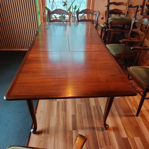 Antiikkinen ruokailu pöytä ja kuusi tuolia