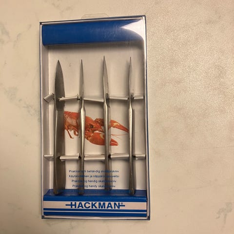 Hyväkuntoiset Hackmanin valmistamat Rapuveitset,punaisella varrella.Veitsen pituus 15 cm.