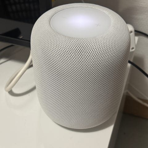 Apple HomePod Mini älykaiutin, valkoinen väri. Laite sisältää virtalähteen ja latauskaapelin. Sopii älykotiäänentoistoon ja ääniohjaukseen. Hyvässä kunnossa.