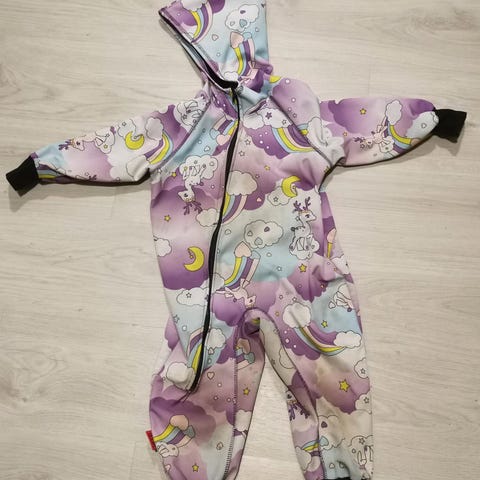 Ihana värikäs haalari. Koko vastaa enemmän 98/104. Kuvista näkyy, että haalari on käytetty ja joissakin kohdissa se on tummempi. Pesu jää ostajalle.