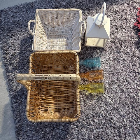 Setti sisältää viltin, korin, astian, maton joka on vaaleanpunainen sekä tuikkuastiat x 4 ja kolme viininpunaista tablettia. Hinta kaikille 5€.