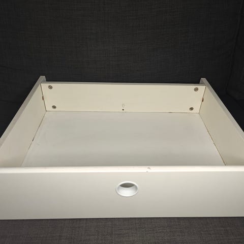 Valkoinen vetolaatikko sinisellä etupaneelilla Muuramen pikku-kolmoskaappiin (kaapin leveys: 39cm, korkeus: 55cm ja syvyys: 52cm). Laatikon ulkomitat: leveys: 48cm, pituus: 37cm, korkeus 12cm. Jäänyt itselle ylimääräiseksi joten tässä varaosaa seuraavalle. Ruuvien kiristelyä /pientä fiksausta vähän kaipaa.