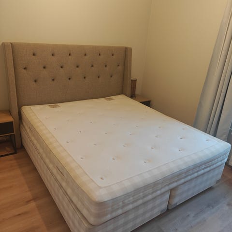 Hästens sänky, jossa ruudullinen kangaspäällinen. Sängyssä on puinen pääty, jossa säilytystila ja lukittava kansi. Sopii makuuhuoneen kalusteeksi ja tarjoaa mukavan nukkumiskokemuksen.