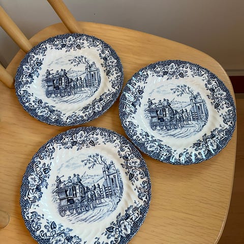 Kaksi The English Scene 23,5 cm sinistä lautasta