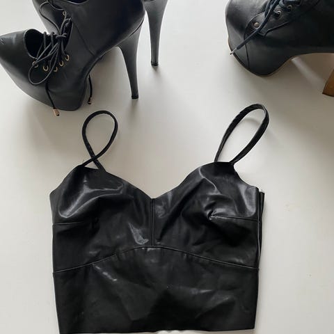 Amisu olkaimeton toppi mustassa värissä. Valmistettu tekonahasta. Vetoketjulla