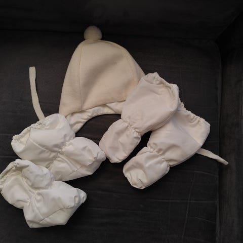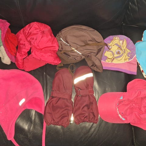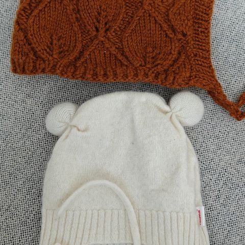 Vauvalle ja vähän isommallekin sopivia pipoja, toppalakkeja, neulemyssyjä (mm. Reima), kypärämyssyjä, kintaita, töppösiä, villasukkia jne. Osa on ihan pienelle vauvalle (2. kuva) ja toiset taaperollekin (3. kuva). Pari ohkaisempaakin hattua, pinkki ja sinivalkoinen (4. kuva vas.).
