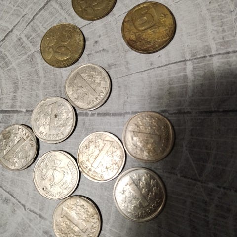 Suomen 10 markan kolikot, metallia, käytettyjä. Kolikoissa näkyy kaksi erilaista puolta, joissa on numeeriset arvot ja kuvioinnit. Kolikot ovat pyöreitä ja kaksivärisiä. 3kpl.yhteishinta 12