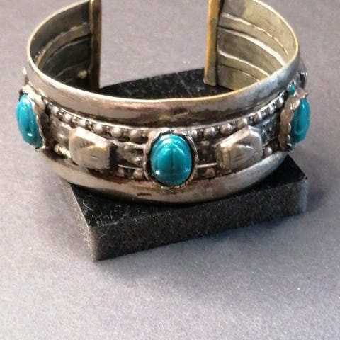 Harvinainen vintage-rannekoru, allekirjoitettu The Franklin Mint, inspiroitunut muinaisen Egyptin kulttuurista ja koristeltu näyttävällä skarabeuksella, joka on uudistumisen ja suojelun pyhä symboli.Valmistettu massiivisestä 925-hopeasta ja koristeltu koboltinsinisillä ja smaragdinsinisillä emalioilla, se edustaa faaraoisten kuvioiden hienostunutta estetiikkaa.Keskellä on kaiverrettu cabochon, joka on muotoiltu kuten scarabée, todellinen kunnianosoitus antiikin kultaseppien taiteelle.Emaloitu koriste, käsin tehty, jäljittelee kuninkaallisten hautojen koruissa esiintyviä arvokkaita sävyjä, antaen teokselle syvän ja ajattoman loiston.Allekirjoitukset ja leimat näkyvissä renkaan sisäpuolella (925 ja monogrammi), vahvistaen toteutuksen laadun.Sormus säilytetään alkuperäisessä Franklin Mint -rasiaessaan, mustassa sametissa.Tila: Erittäin hyvä kunto, näkyvä ikääntymisen patina ja mikrojälkiä ajan vaikutuksesta, emali ehjä, keskikivi erinomaisessa kunnossa.Yksi keräilijöiden, Egyptin taiteen harrastajien ja voimakkaiden symbolien ystävien etsimä esine.KokoSormuksen koko: noin FR 62 / EU 62 (katso kuvat tribouletin kanssa).Tasanko: noin 20 mm korkeaNäyttävä sormus, täynnä historiaa ja valmis käytettäväksi.Hyvät huutokaupat Catawikissä!Franklin Mint -kaulakoru, scarab-korvakoru, Egypti, 925 hopeaa, emali, vintage-faraoni, Kleopatra, 1980-luku, keräilijöiden alkuperäinen laatikko, korut, symbolinen nainen ja mies, egyptiläinen antiikki, uudelleenlähtö, statement-koru, harvinainen koriste, väri renessanssi, amuletti, suoja, keräilyesine.