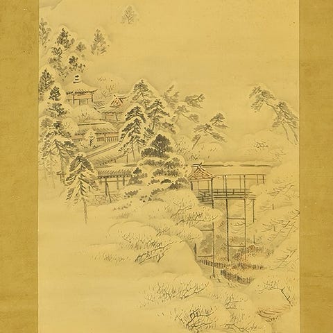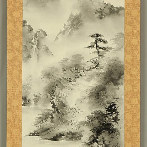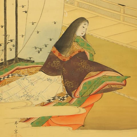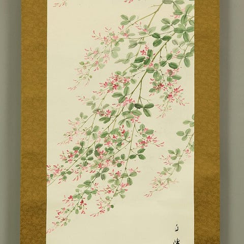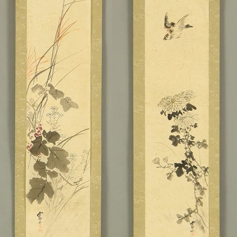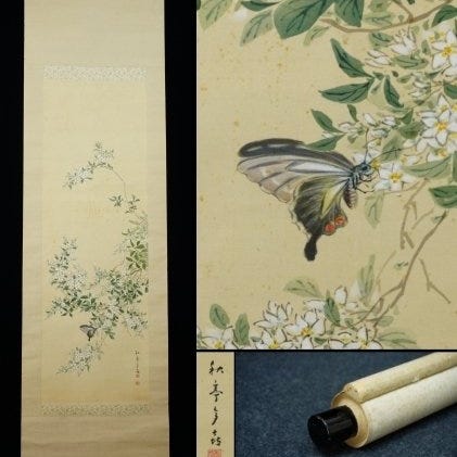 Hieno japanilainen kakejiku (kakejiku) tekijä Hayami Shokin (toiminnassa 1926–1945), Kyoto-syntyinen taiteilija varhaisen Showa-kauden ajalta ja Uemura Shōenin oppilas. Tunnusomainen hänen hienostuneista naiskauneuden kuvituksistaan, Shokinin teos ilmentää modernin bijin-ga:n eleettömän eleganssin ja herkkähipiäisen sensitiivisyyden ominaisuutta. Tämä kakejiku kuvaa kimonoonsa sonnustautunutta kauneutta ihailemassa ploomien kukkia, ja sen on tehty hennolla viivalla ja pehmeällä, tunnelmallisella värityksellä, joka välittää hetken lempeästä pohdiskelusta. Teos on signeerattu ”Shokin” ja sinetöity ”Shokin joshi”, ja siihen kuuluu säilytyslaatikko, joka varmistaa huolellisen säilytyksen. Rauhallinen ja keräilyarvoinen esimerkki naisfiguuriin liittyvästä muotokuvataiteesta varhaisen 20. vuosisadan japanilaisessa taiteessa.