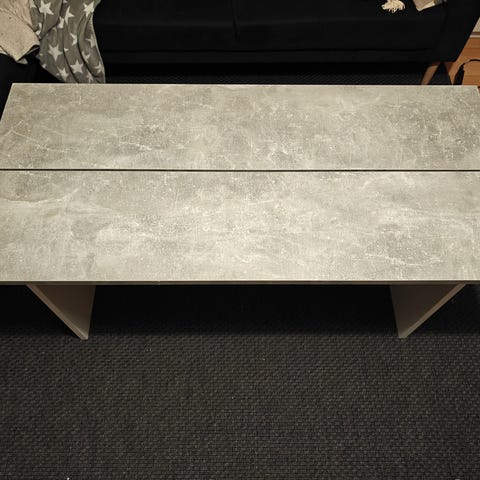 Vanha sohvapöytä, josta pinta hieman kulunut. Hyvin toimii silti ja on tukeva.