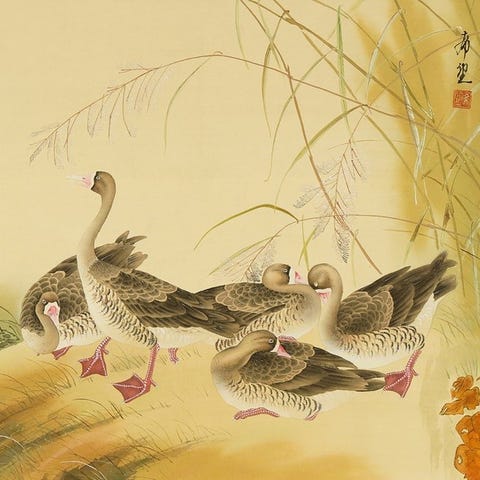 Hirose Tohon (1875–1930) suunnittelema pari eleganttia japanilaista riippuvaa kääröä. Toho oli Meiji- ja Shōwa-aikakausien taidemaalari. Amano Sōsekin ja myöhemmin Araki Kanpon johdolla opiskellut Toho piti näytteitä Bunten- ja Teiten-näyttelyissä parikymppisyydestään lähtien ja opetti myöhemmin Tokion teknillisessä korkeakoulussa ja Tokion naisten normaalikoulussa. Nämä kääröt kuvaavat varpusia krysanteemien, pampaheinän ja syyskasvien keskellä, ja ne on maalattu herkällä siveltimenvedolla ja hienostuneella vuodenaikojen tunnelmalla. Jokaisessa käärössä on Tohon nimikirjoitus ja sinetit. Setin mukana tulee säilytyslaatikko, jonka on arvioinut tunnettu kukka- ja lintumaalari Goto Koho (1882–1958), jonka teoksia on valittu toistuvasti myös Bunten- ja Teiten-näyttelyihin. Huomaa: kääröissä on näkyviä tahroja, joten niiden kunnosta huolestuneiden ostajien tulisi ottaa tämä huomioon.