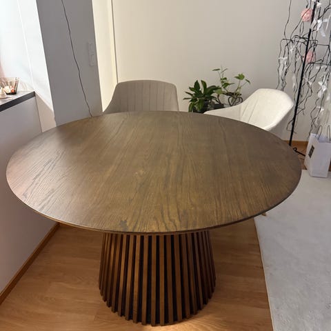 Myydään uuden isomman pöydän tieltä ihana, pyöreä 110cm halkaisijaltaan oleva, musta ruokapöytä. Ostettu Iskusta 2018. Kunto hyvä, mutta pöydän maalipinnassa näkyy käytön jälkiä.