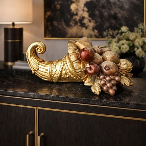 Tämä koristeellinen cornucopia sisältää rikkaat yksityiskohdat metallisistä hedelmä- ja lehtikuvioista, luoden vaikuttavan ja ylellisen ilmeen. Se symboloi runsautta ja vaurautta, ja lisää klassista eleganssia mihin tahansa sisätilaan. Täydellinen koristeellinen yksityiskohta konsolille, kaapille tai näyttöpöydälle.