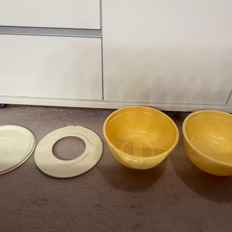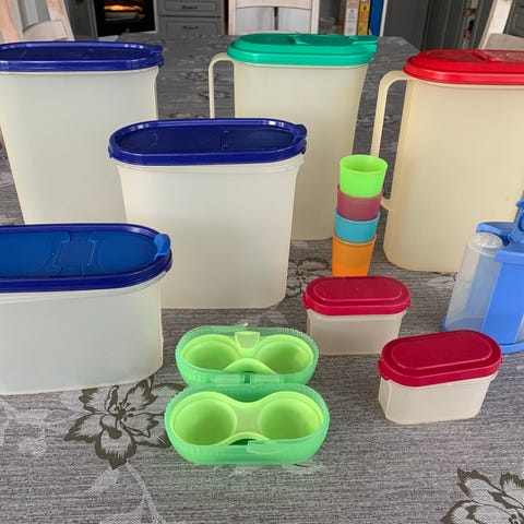 Tupperwarea: 2 kannellista mehukannua, juustokupu, 5 lautasta + kannet, 7 mukia + kannet, pieni kannellinen kippo. Myydään kaikki kerralla, yhteensä 15 €,