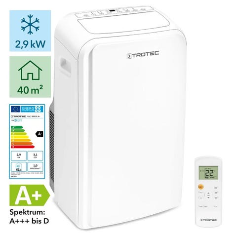Trotec PAC 3501 S ilmastointilaite, jäähdytysteho 3,5 kW, valkoinen väri. Laitteen energiankulutusluokka on A, ilmavirtaus 65 m³/h, virrankulutus 1,4 kW. Sopii tilojen jäähdytykseen ja ilman kosteuden hallintaan.