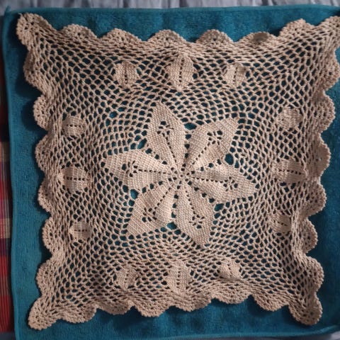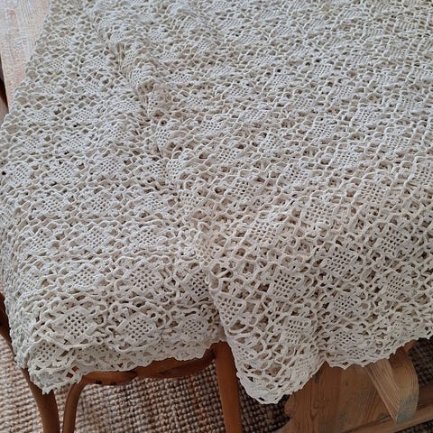 Kirjailtu pitsiliina, jossa on koristeellinen kuviointi ja avoin pitsityö. Väri luonnonvalkoinen tai beige. Sopii koristekäyttöön kodin sisustuksessa.Koko n. 82 x 41 cm.