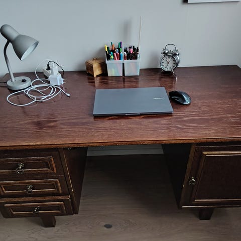 Työpöytä, jossa puinen työtaso vaaleanruskeana. Pöydässä on kaksi säilytyskaappia, joista vasen kaappi sisältää lasiovellisen osion ja oikealla puolella on useita vetolaatikoita. Pöytä soveltuu työ- tai tietokonepöydäksi. On hieman ajan patinaa, mutta kaikki osat toimii. On ollut kotona etätyökäytössä. Kaapit ja pöytälevy irtoavat kuljetuksen ajaksi.