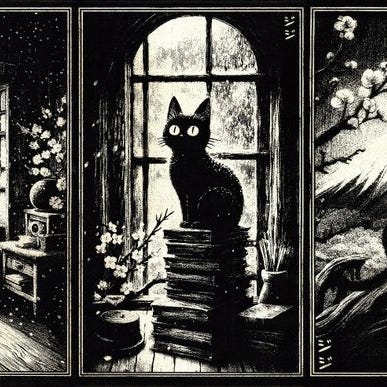 Tämä monokromaattinen triptyykki ammentaa inspiraationsa Edo-kauden puukuvioestetiikasta, vintage-kyltteistä ja leimasimimaisesta kehyksestä, yhdistäen ne leikkisään mutta salaperäiseen Jiji-henkeen. Kuvia ei pidä tulkita tarinoina vaan ikoneina — tiivistettyinä hetkissä, jotka tuntuvat virallisilta, tutuilta ja kummallisen ajattomilta, ikään kuin arkistosta, jonka tarkoitus on unohtunut.