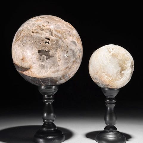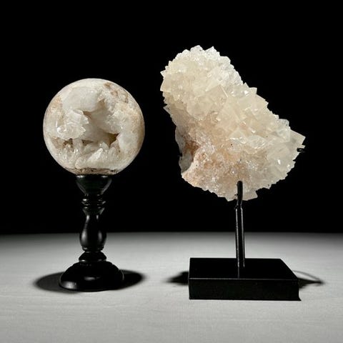 Upea kvartsikristallikimpun ja pallon pari räätälöidyillä jalustoilla.