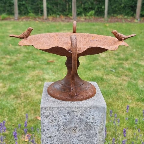 Tämä on ihastuttava seisova lintukylpyamme. Siinä on takorautainen jalusta, kaunis suuri allas ja kaksi koristelintua. Mitat ovat seuraavat (noin):