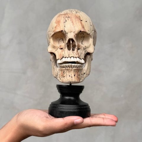 Häivähdyksellinen ihmiskallo, jossa on kaiverrettu käärme, joka on tehty hirven sarvesta ja on kietoutunut kallon ympärille. Kallo on käsin veistetty mestaripuusepän toimesta yhdestä kiinteästä tamarind-puusta. Alaleuka ja kallon pää ovat kaksi osaa, jotka on kiinnitetty pienellä tamarind-puupikalalla kummastakin sivusta, jotta leuka voi avautua ja sulkeutua. Kallon hampaat on valmistettu lehmänluusta ja ne on huolellisesti kaiverrettu mahdollisimman aidoiksi. Tamarind-puu on kauniin syykuvioinen, mikä tekee tästä kalosta todellisen katseenvangitsijan.