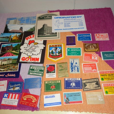 16 erilaista tulitikkuaskin etikettiä ja 7 erilaista postikorttia.