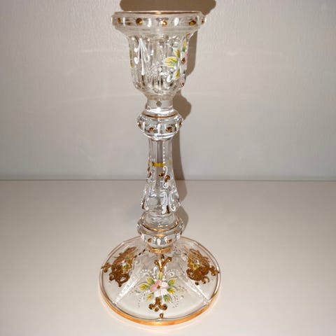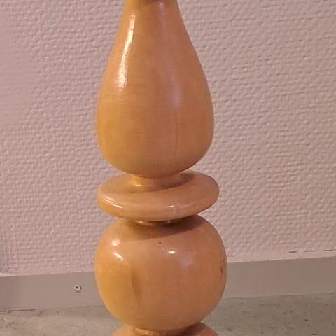 Vihreä / turkoosi kynttilänjalka. Toiminee myös maljakkona. Koko korkeus noin 30 cm. Kapea voin 19 cm varsi jonka päässä olevan pallon halkaisija noin 10 cm. Jalan halkaisija myös noin 10 cm
