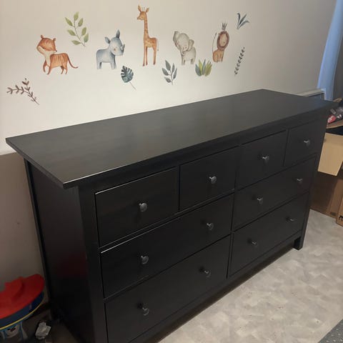 Kaksi korkeaa Hemnes-kaappia, joista toisessa on ovi, sekä samaan sarjaan kuuluvat tv-taso ja ylähylly. Nämä on olleet isona kokonaisuutena: kirjahylly-lasikaappi-tv. Iso ja tilava kokonaisuus, joka ei mahdu uuteen kotiin.