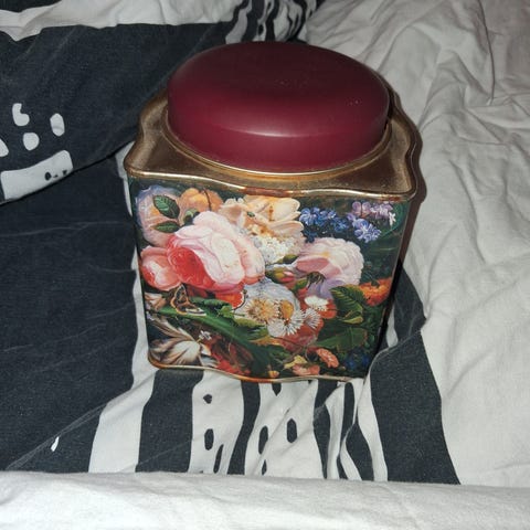 Vanha pieni puinen rasia käsinmaalatuilla kukkakuvilla. Halkaisija noin 10 cm.
