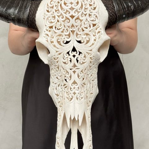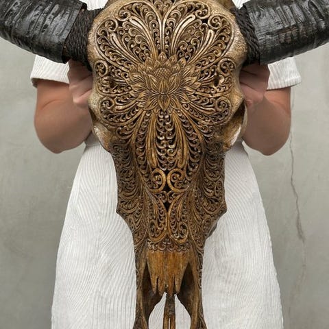 Suuri vesipuhveli-kallo, joka on kaiverrettu käsin lahjakkaiden balilaisten käsityöläisten toimesta. Heidän isänsä ovat siirtäneet ikivanhan kaiverrustaidon pojilleen. Tämä kallo on täysin avattu kaiverruksella. Kaiverrus on poikkeuksellisen korkealaatuista.