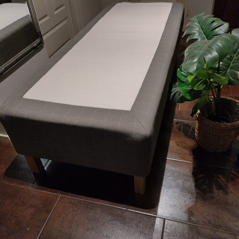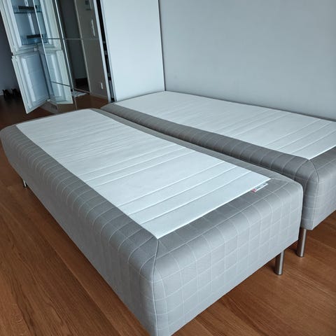 IKEA sänky, verhoiltu vaaleanharmaalla kankaalla. Sängyssä on puujalat ja se tarjoaa tukevan alustan patjalle. Sopii useimpiin makuuhuoneisiin ja tarjoaa yksinkertaisen ja neutraalin ilmeen. Pehmeä, ollut lapsella käytössä, en suosittelisi aikuiselle. On liian pehmeä, käyttäjälle ostettu nyt seuraava koko. Petarin suojus juuri pesty. Sängyn hinta petareineen ovh. Ollut 339€ ja jalat on 40€.