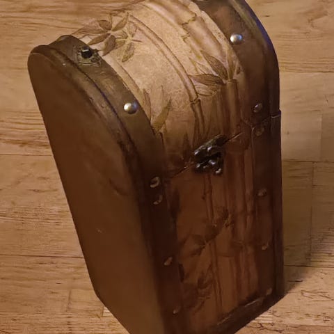 Ihana, hyväkuntoinen puurasia koristeleikkauksin. Koristellulla sivulla sininen maali, muut sivut puunväriset. Tasainen kansi, joten toimii myös tasona/pienenä hyllynä niin halutessa 😊