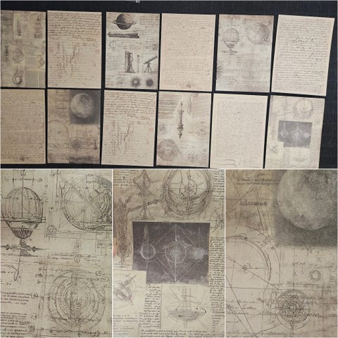12 kpl uusia todella upeita vintage / antiikki henkisiä papereita erilaisilla tiede / avaruus kuvioilla ja ns. keksityillä teksteillä skräppäykseen askarteluun korttien tekoon tai vaikkapa kehyksiin niin saa todella kauniit taulut sisustukseen! Lisään lähiaikoina paljon erilaisia upeita papereita myyntiin.