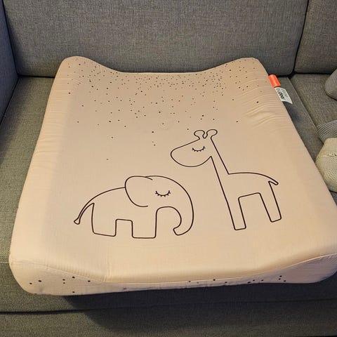 Kuvanmukainen Done by deer pehmeä hoitoalusta, jossa korotetut sivureunat. Irrotettava päällyskangas on miellyttävää satiinipuuvillaa.
